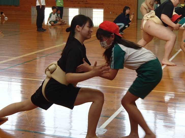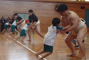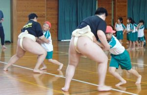 県の相撲協会の方や大学生の方が来てくださり、すもう教室を行いました。