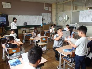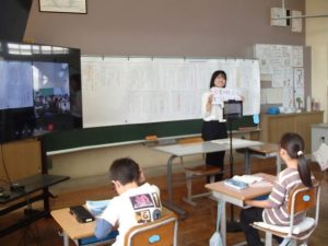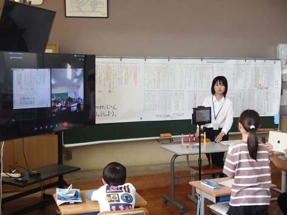 3年生が、「ちいちゃんのかげおくり」の学習の中で、市内の小学校の3年生一クラスとオンラインでつなげての合同学習をしました。